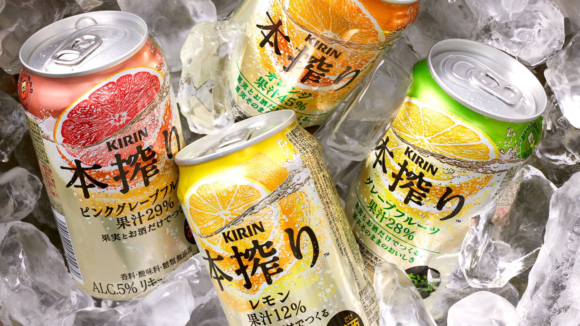 「本搾り™」は2003年に誕生した商品です。ロングセラー商品のデザインリニューアルの際は、市場を含むブランドの変遷に徹底的に向き合い、ブランドの歩みを大切に消化し理解していきます。「果実とお酒だけでつくる」ブランドの本質をシンプルに、魅力的に伝えるため、お酒に浸る果実とそこから滲み出るおいしさを描き、上質感のあるシャンパンゴールドを本搾りの共通カラーとして策定し、新たな「本搾り™」らしさを演出しました。