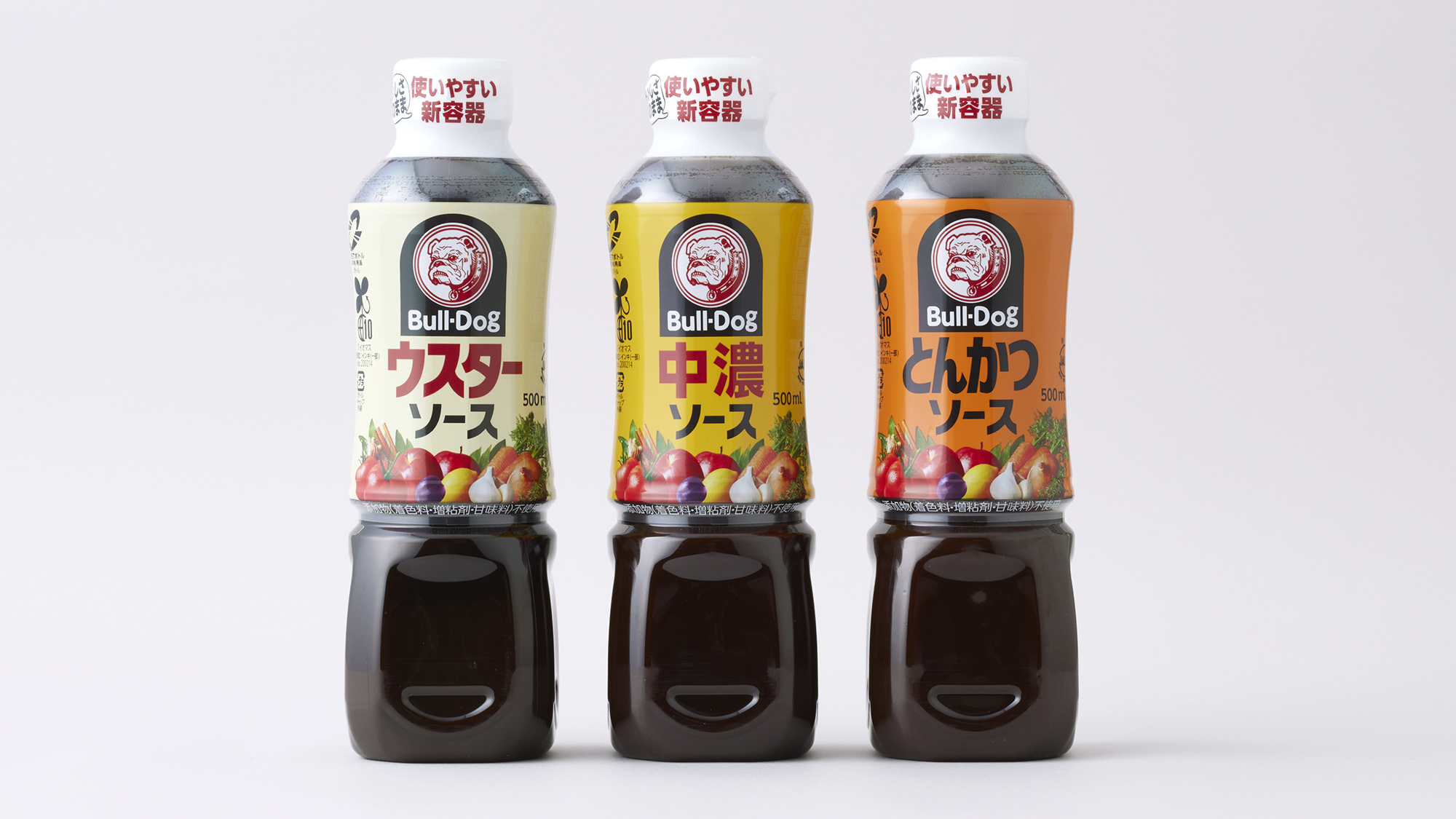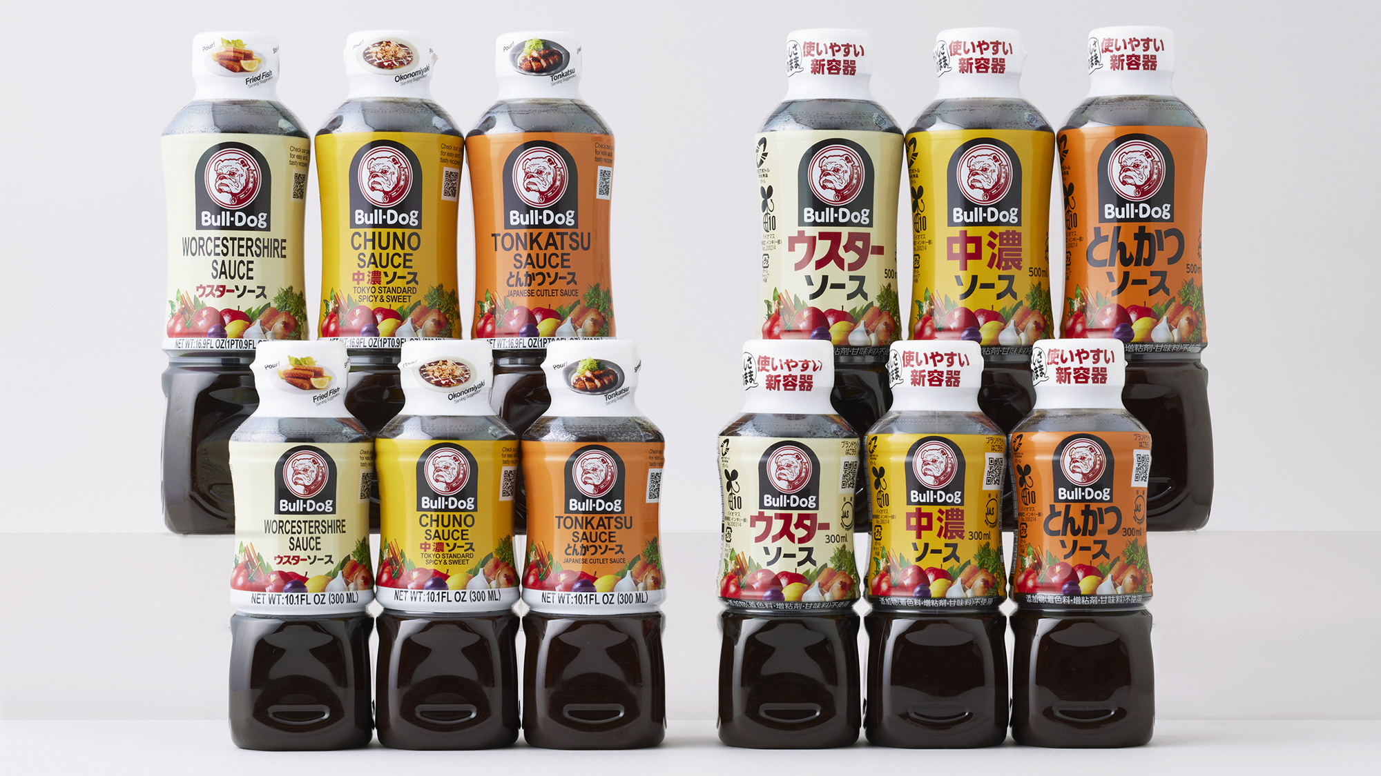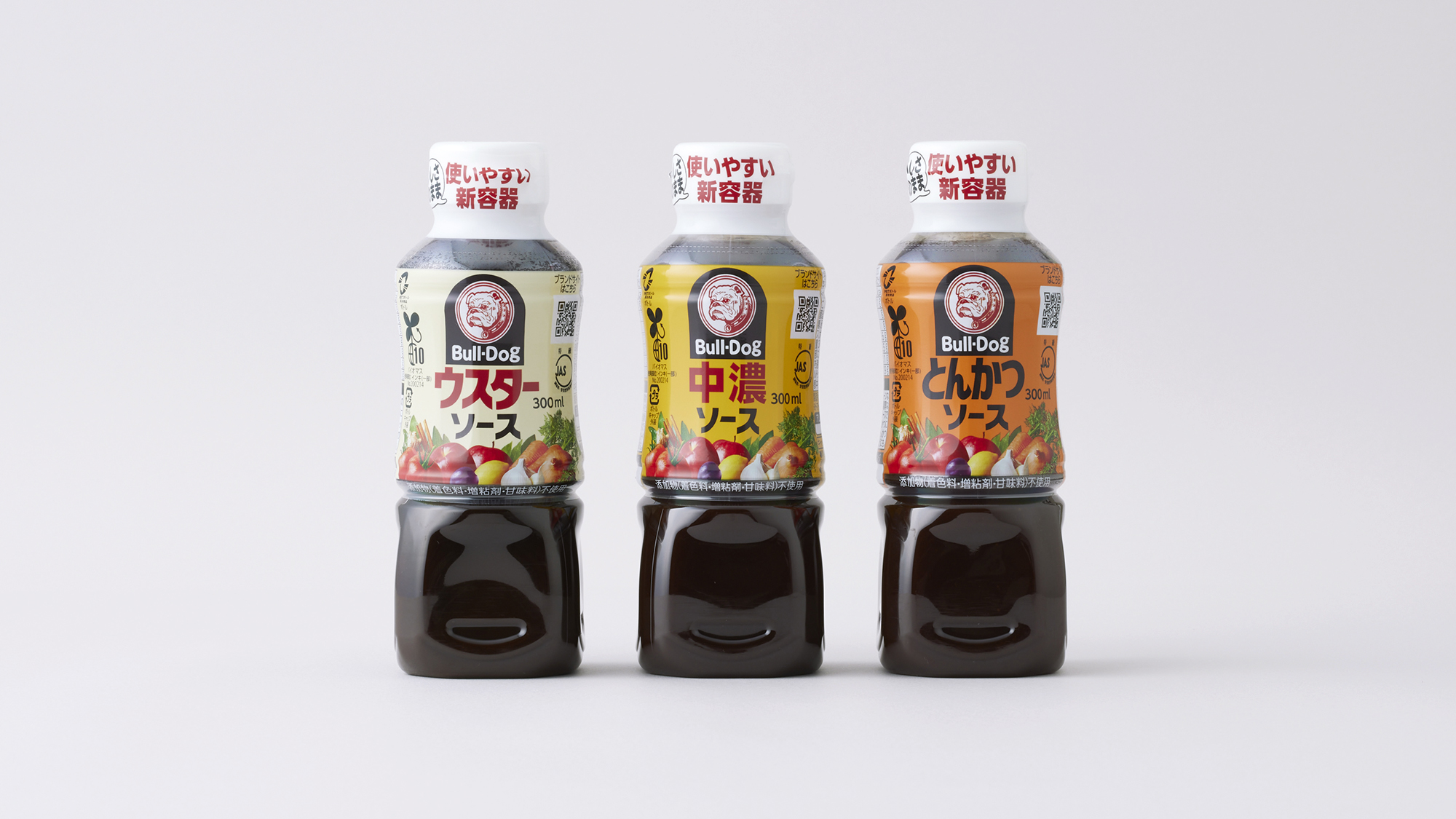 ブルドックソースの定番ソース3種とうまソースの容器が四角から丸みを帯びた形へ一新した。新容器にも愛着を持ってもらえるように、旧パッケージの要素を組み取り、正面全体のレトロ感あるイメージはそのまま踏襲している。