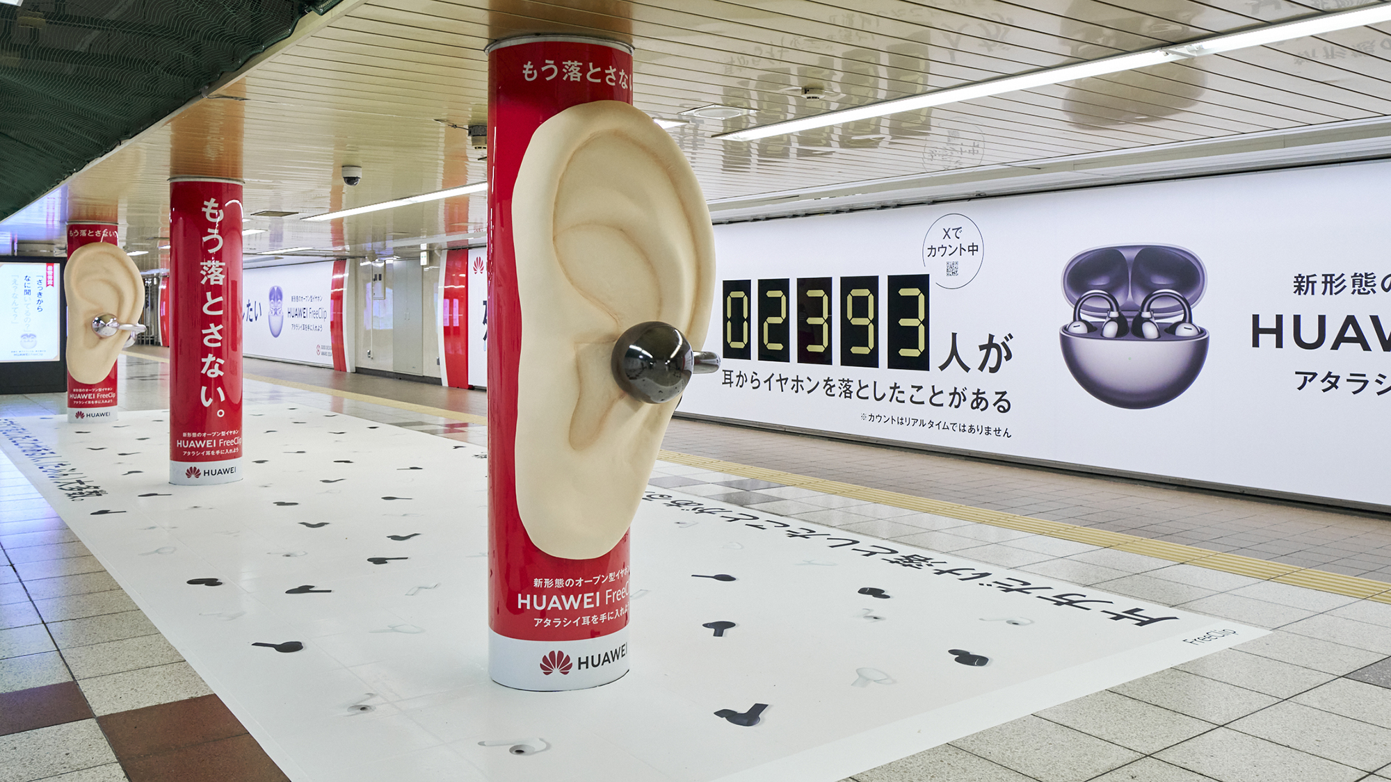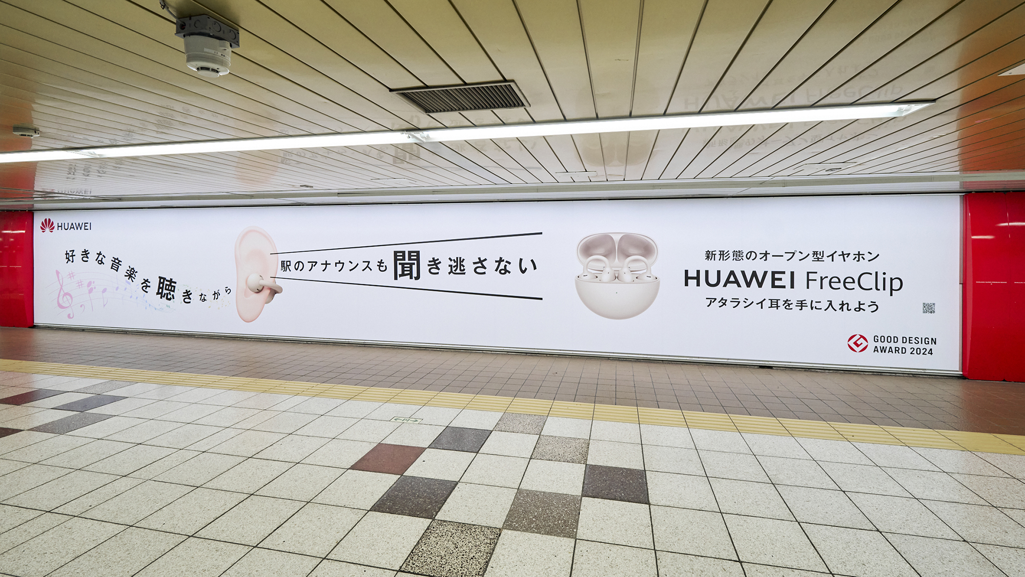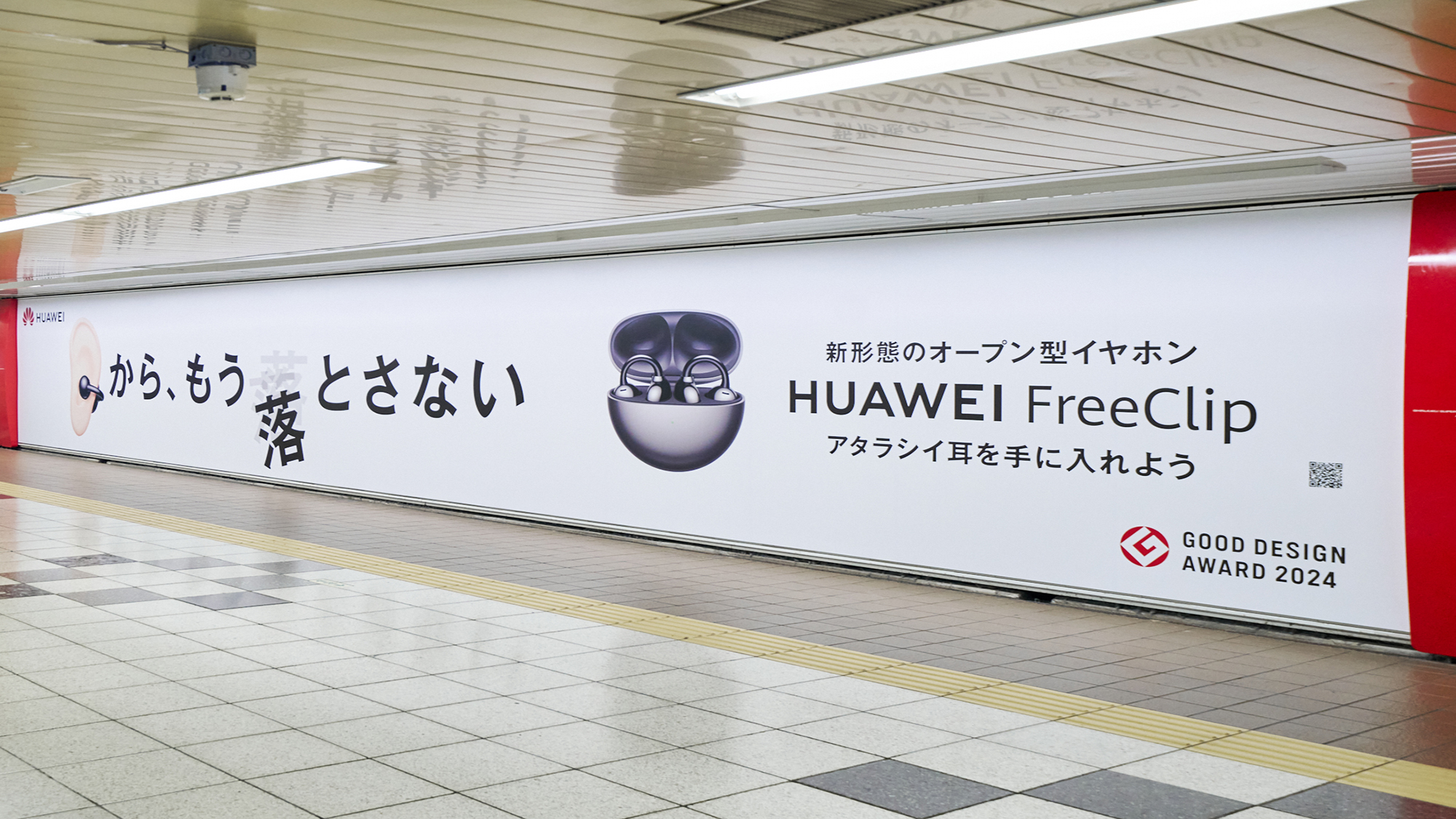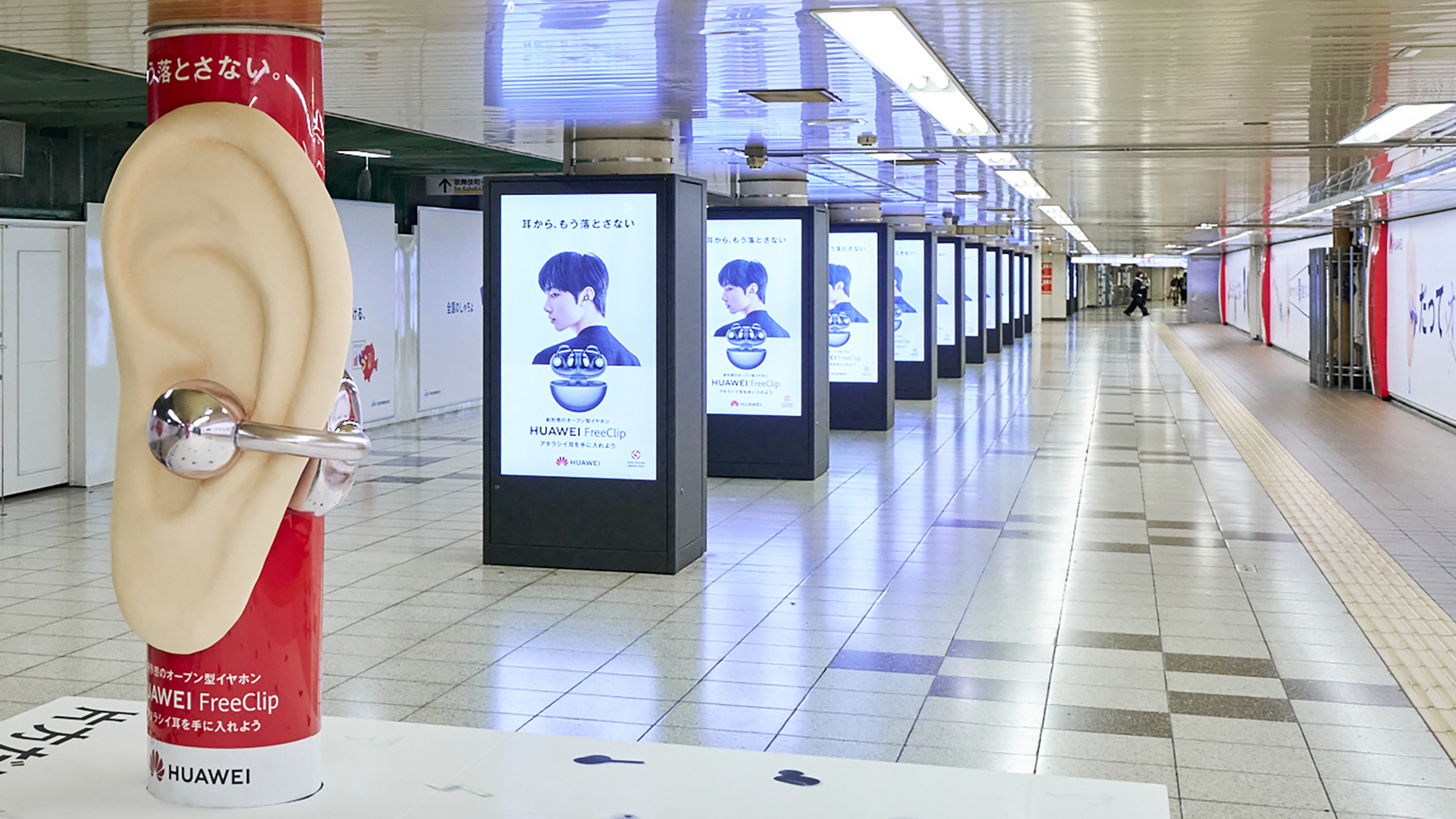 - HUAWEI オープン型イヤホンFREE Clipは自分の好きな音を聴きながら、周辺の音も聞こえるイヤホン。耳につけたら外れにくい特徴をもっており、駅での落とし物ランキングがイヤホンである事も訴求し、新宿駅集中貼りを展開。SNSで募集したイヤホンを落とした事のある人の数を掲載したサイネージとも連動。PR効果も狙い「イヤホンの日」に展開した。