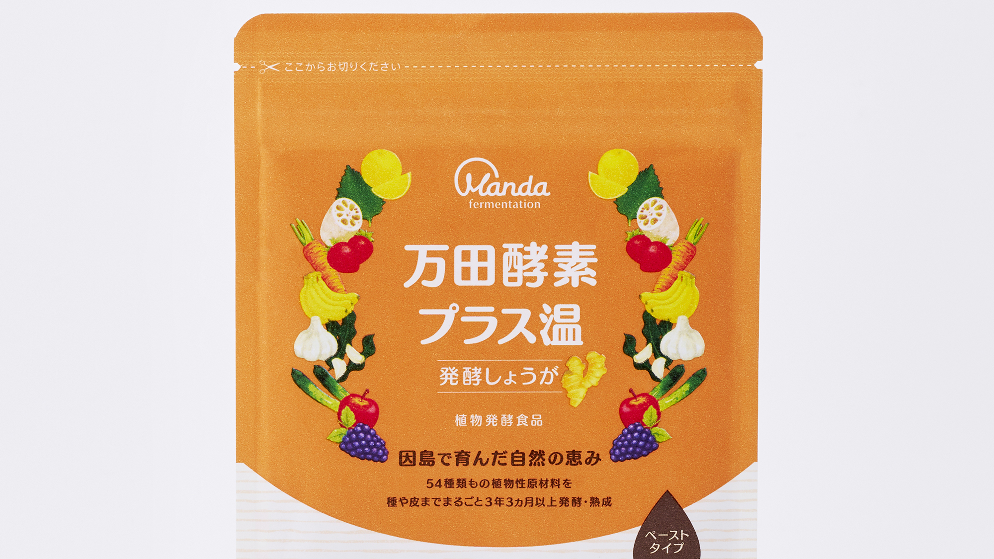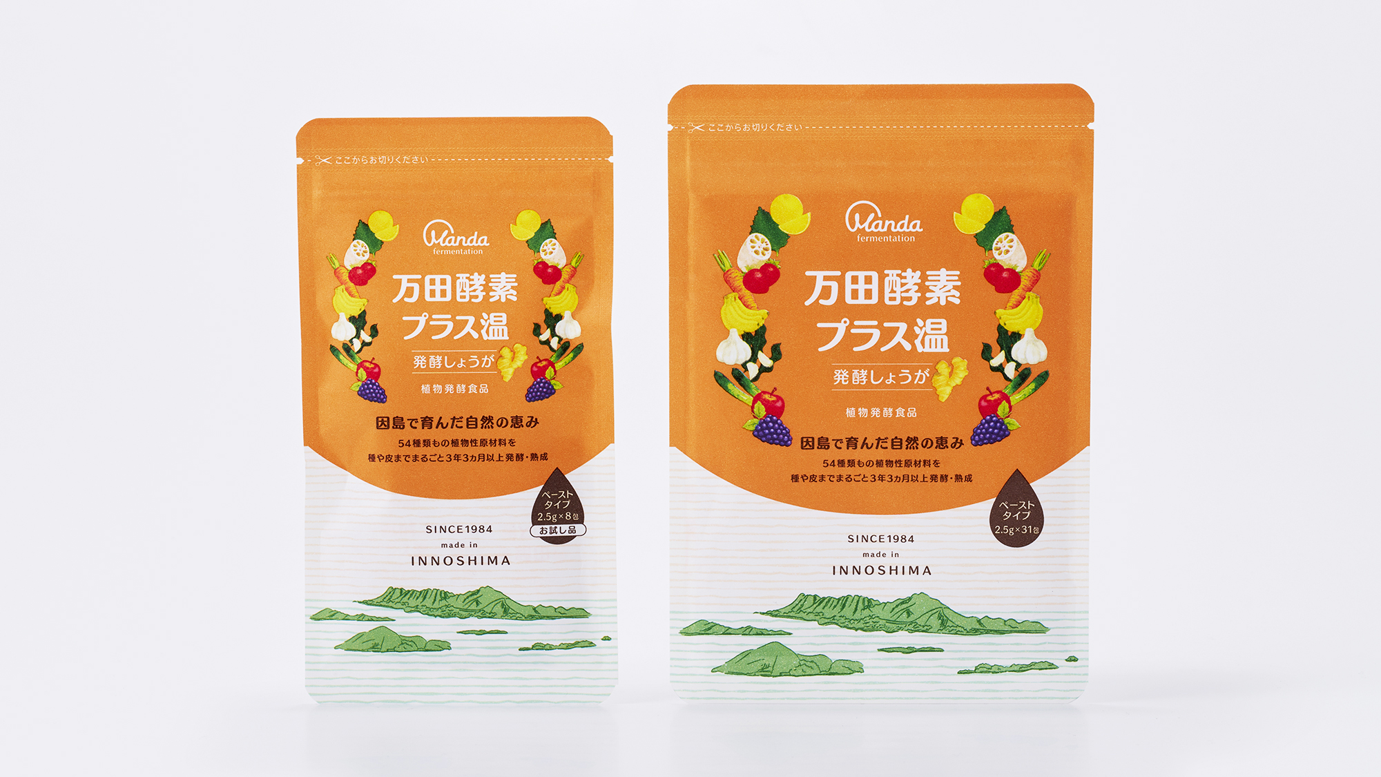 - しょうがのイメージをオレンジベースで表し、植物性原材料イラストが囲む商品名看板を作成した。万田酵素を育む因島から見た瀬戸内海の豊かな自然をイラストで表現している。包材には紙を主成分としたエコ包材を初めて採用することになったため、印刷特性をふまえた上で、ブランドや商品の魅力が最大限に伝わるような温かみのあるパッケージを目指した。