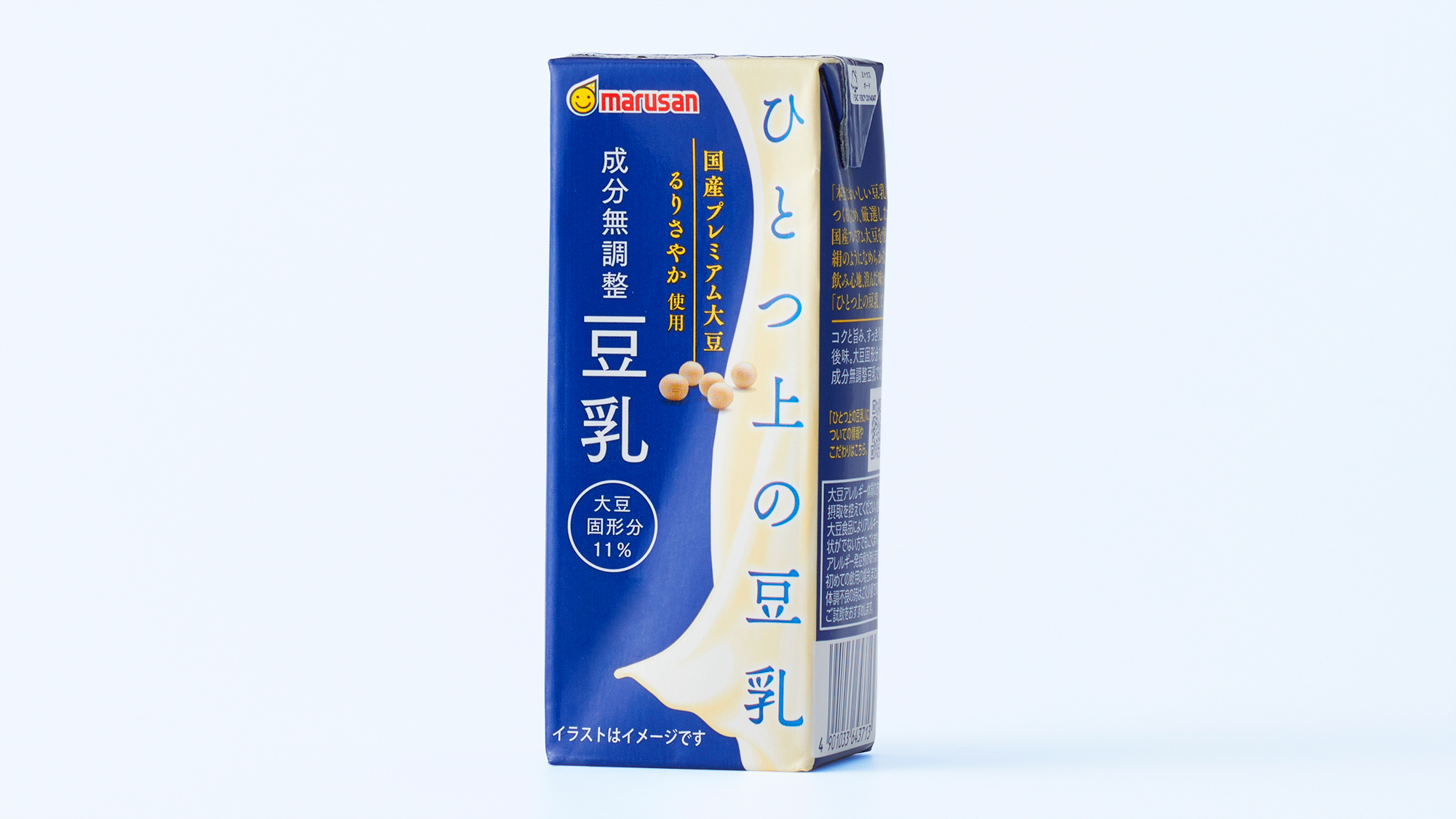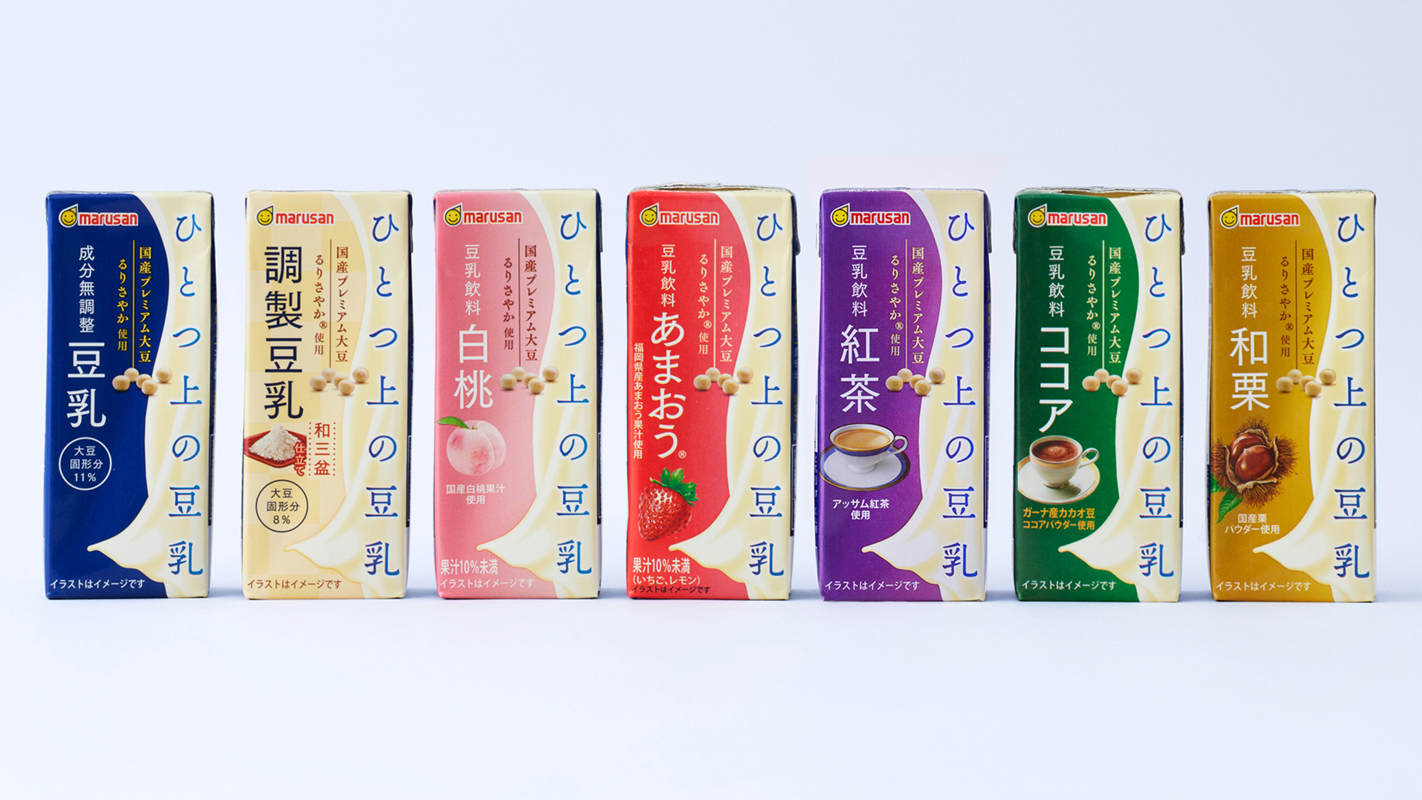 - 豆乳のおいしさを極めるために大豆を選び抜き、育てるところからスタートした「ひとつ上の豆乳」シリーズ。ロイヤルブルーをキーカラーとしたパッケージで2009年に誕生した。2021年に国産プレミアム大豆「るりさやか」を採用するタイミングで「おいしさ」を全面に押し出したデザインのフルリニューアルを行った。なめらかな舌触りをイメージした豆乳シズルを印象的なキービジュアルとして成立させ、豊富なフレーバー展開でもシリーズ全体の統一感を守ることを心がけた。