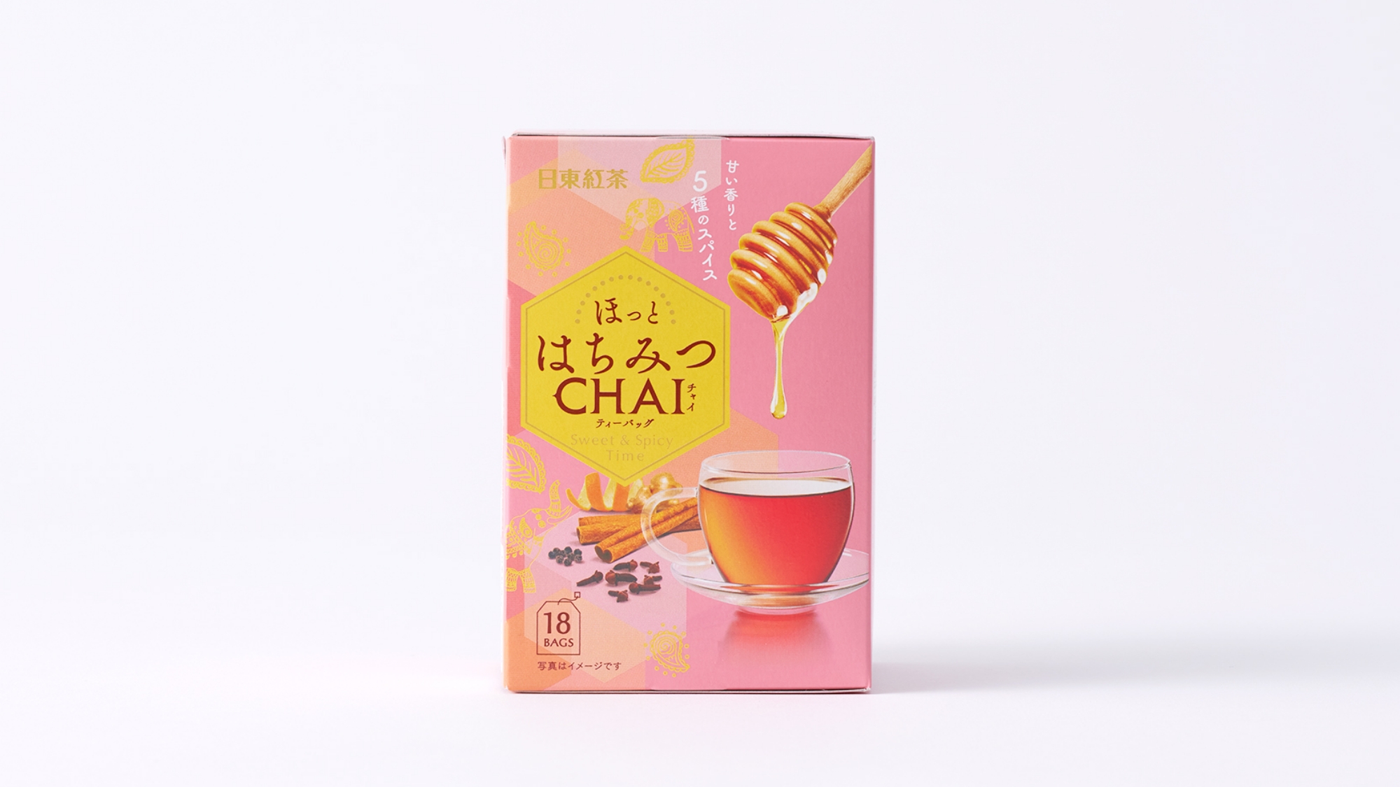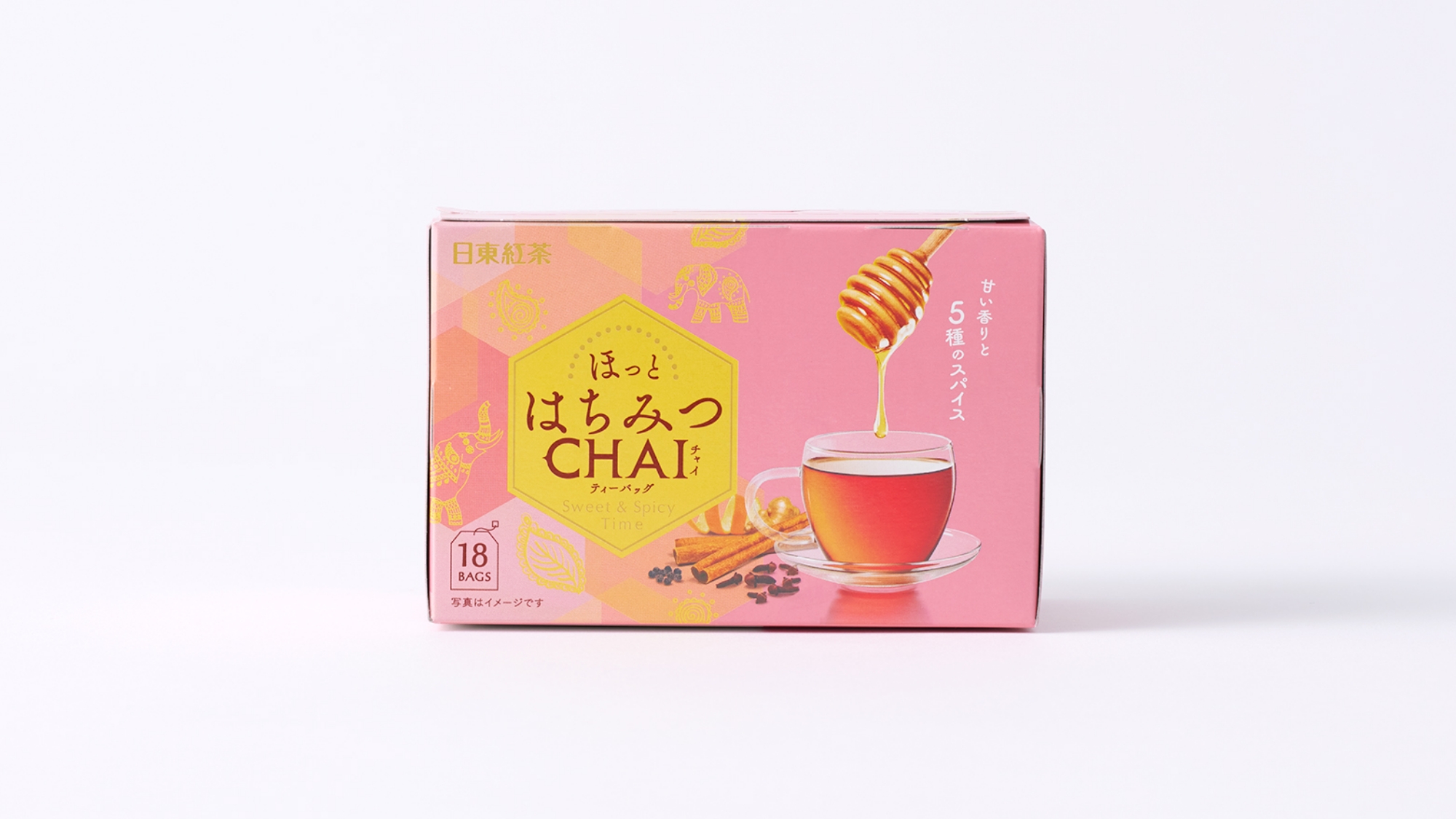お湯を注ぐだけで楽しめる、甘いはちみつ紅茶の「チャイ」。スパイスの押し出しとチャイのおいしさを想起するカラーリングの検証を重ねた。