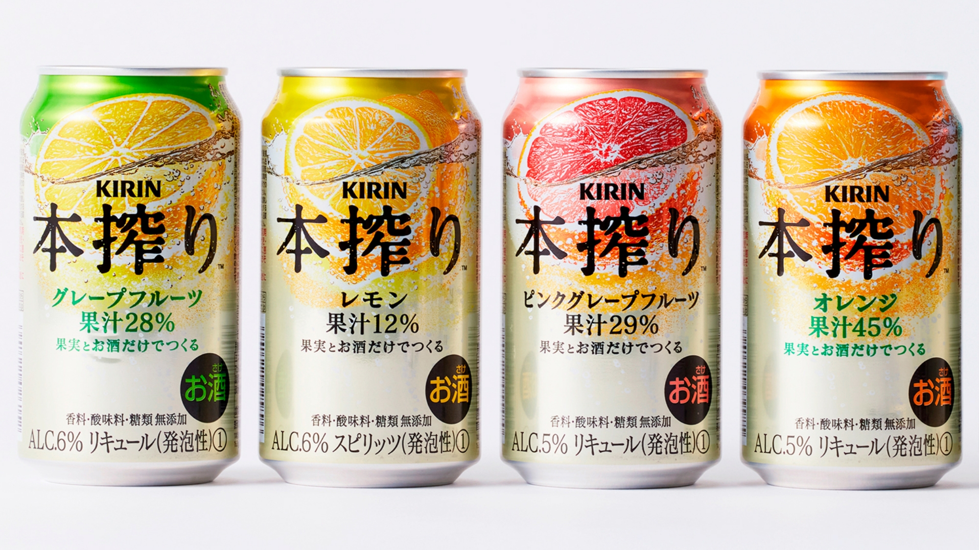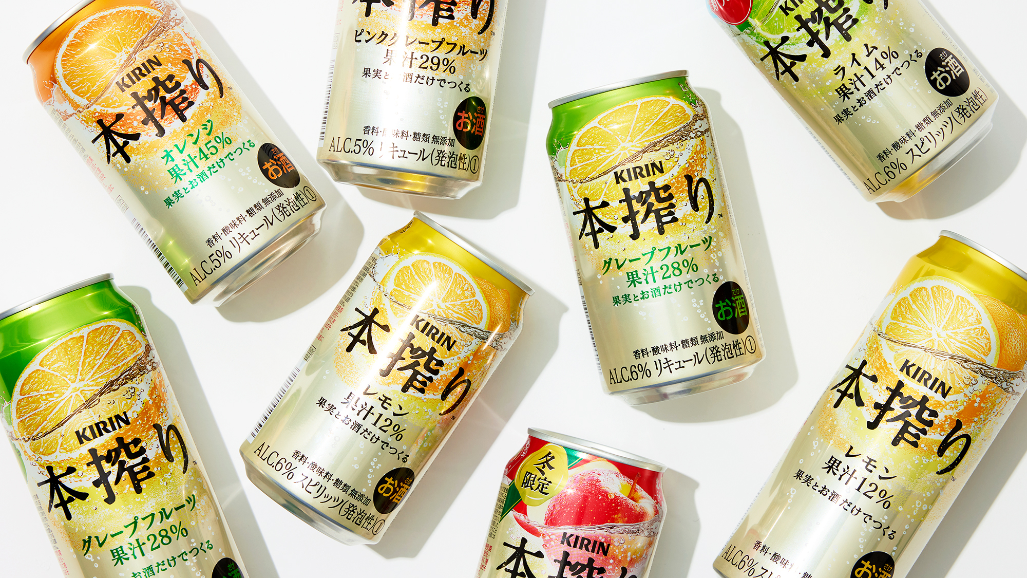 20年以上愛されるロングセラーチューハイのパッケージのデザインリニューアルを行った。市場や時代の変化によって「本搾り™」の価値が伝わりづらくなっていた。「果実とお酒だけでつくる」という本質をシンプルに魅力的に伝えるため、上部にお酒に浸る果実とそこから滲み出るおいしさを丁寧に描いた。他のチューハイにはないその上質性をシャンパンゴールドで表現し、チューハイ市場の中で「本搾り™」らしさが伝わるように演出した。