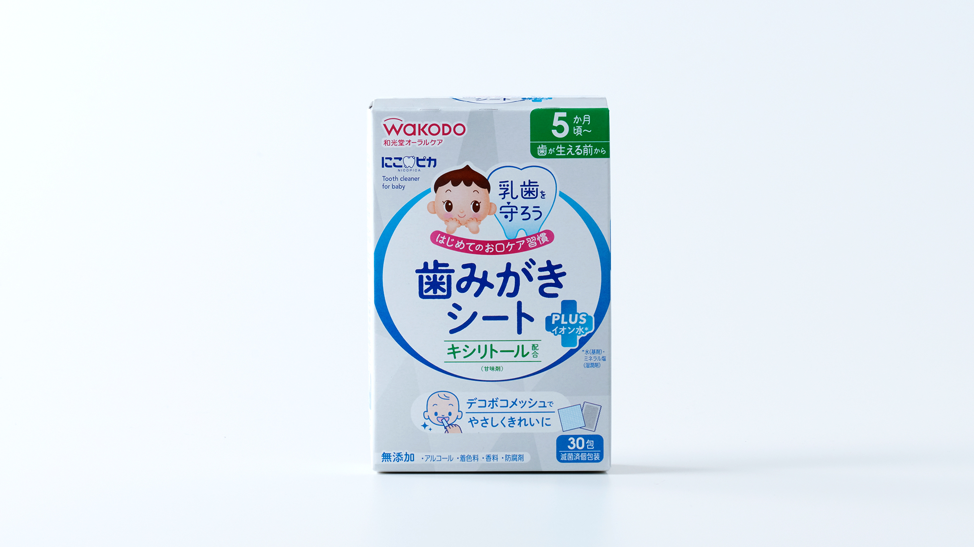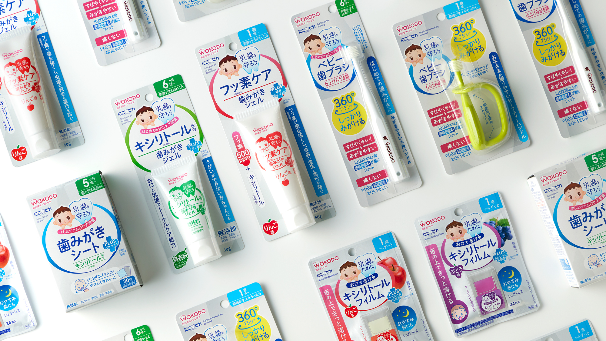 WAKODOのシンボル「わこちゃん」とスローガンである「乳歯を守ろう」をセットにし、ブランド感を担保。ベビー用品としては品質感のあるトーンで、はじめてのお口ケアに迷うママ・パパの不安をケアできるようなデザインを心がけた。