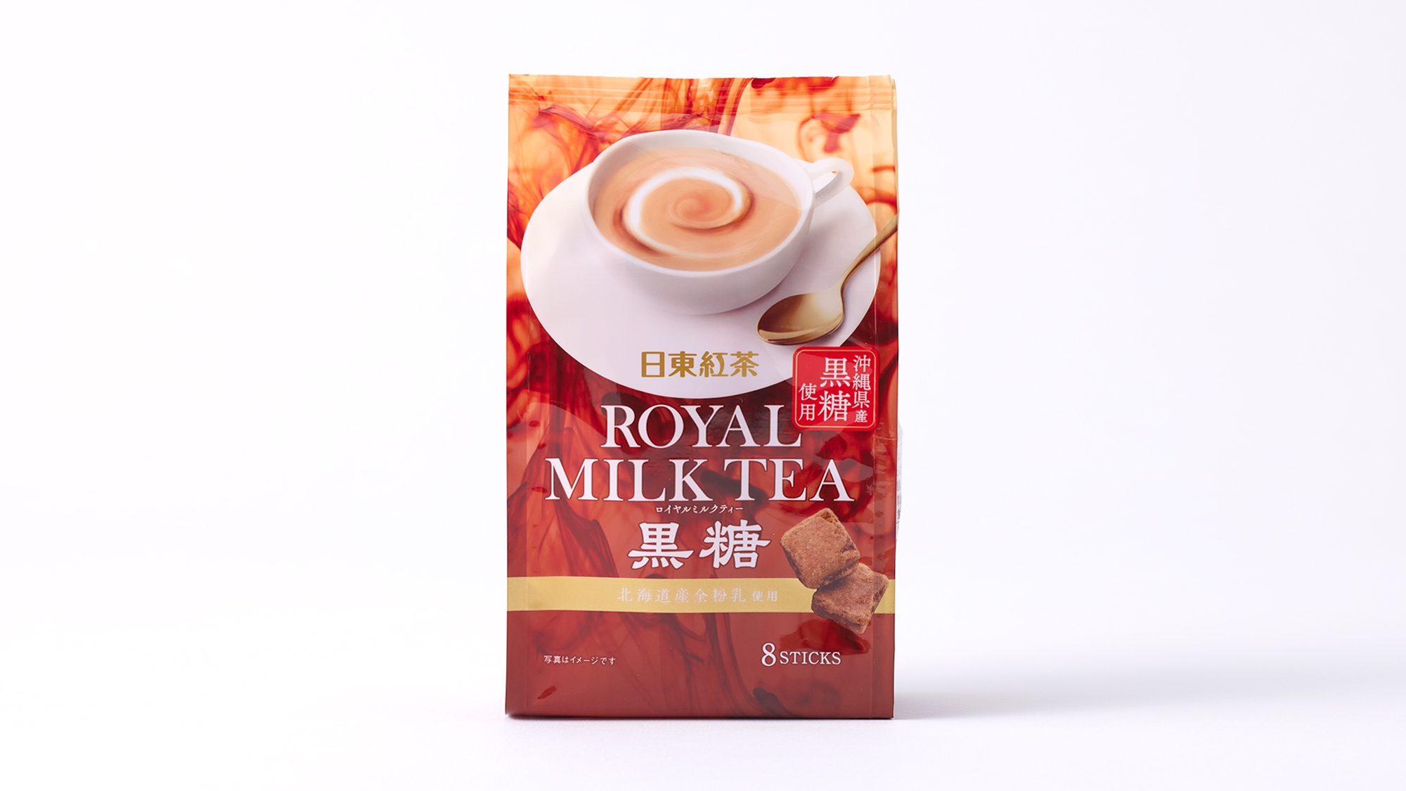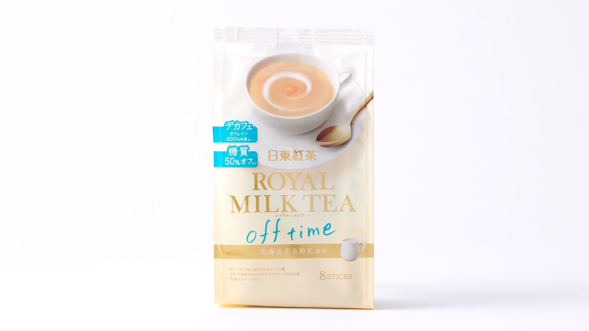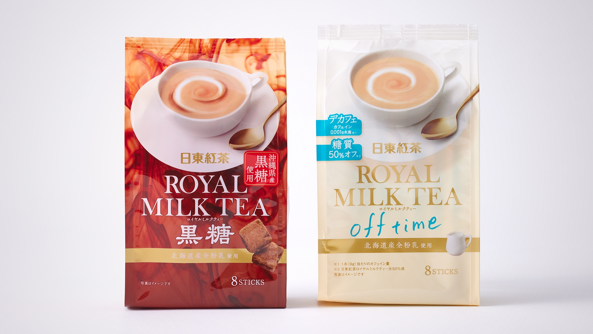 - ロイヤルミルクティーシリーズは根強い人気があり、定番商品以外に味のバラエティーや健康価値を付加したラインナップを展開している。ロイヤルミルクティー黒糖は台湾のティースタンドをイメージし、背景に黒糖が溶け出した写真をあしらった。ロイヤルミルクティーoff timeは糖質とカフェインを抑えた商品。健康的でありつつミルクティーの味わいはそのままという価値を、パール地のグラデーションと水色の差し色、そしてoff timeというネーミングに込めた。