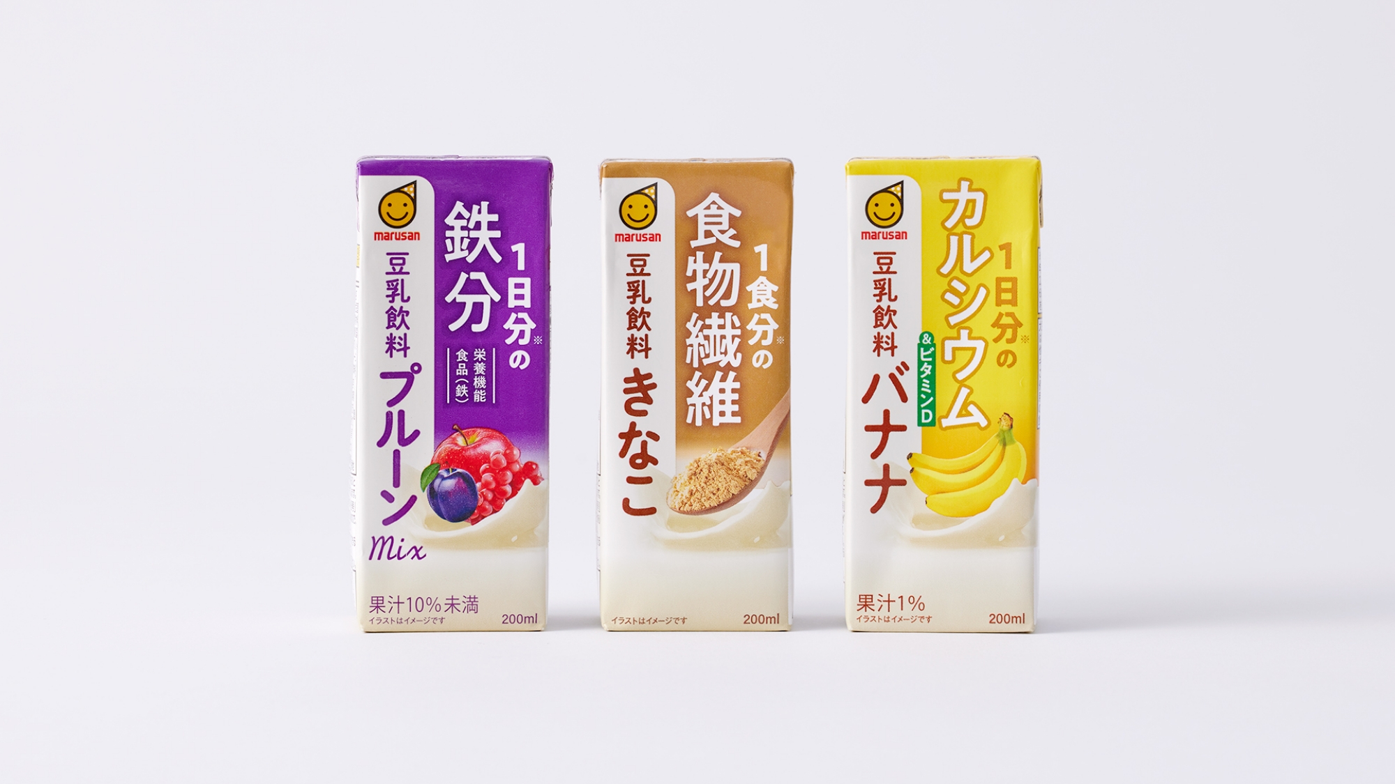 - 日々の食事の中で不足を感じている栄養素「鉄分」「食物繊維」「カルシウム」の摂取に特化した豆乳飲料。その機能は伝えながらサプリ等ではない「おいしさ」も同時に感じさせたい、という要望があった。栄養素の視認性は高めつつも「フレーバー付きのおいしい豆乳飲料」にみえるように、色合いやフォントの選定などでバランスを整えた。