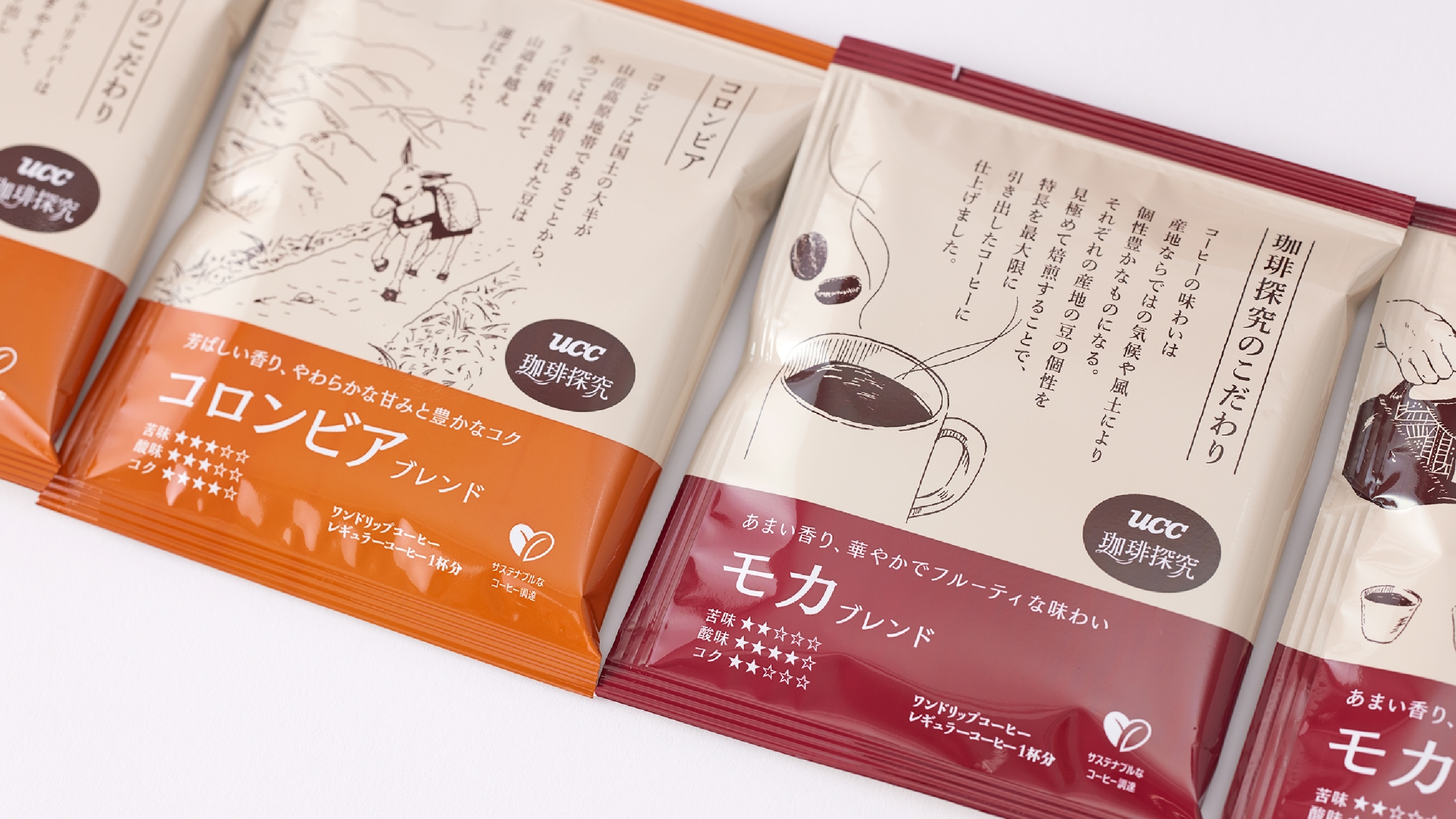 ブランドのコンセプトをより明確にしながら、多種多様なコーヒーが並ぶ中コーヒーベテラン層に向けて一目で「産地」を感じるパッケージにする必要があった。それぞれの産地の風景を選定し水彩で描くことで、実直に産地が伝わり、上質な世界観になると考えた。 風景に、焙煎した豆や抽出したコーヒーをイメージしたオーバルロゴを重ねて、ブランドコンセプトとコーヒーのおいしさを両立させたデザインとした。ブランドサイトもパッケージの世界観と一貫性をもたせながら、産地、農園のコラムの充実を図った。